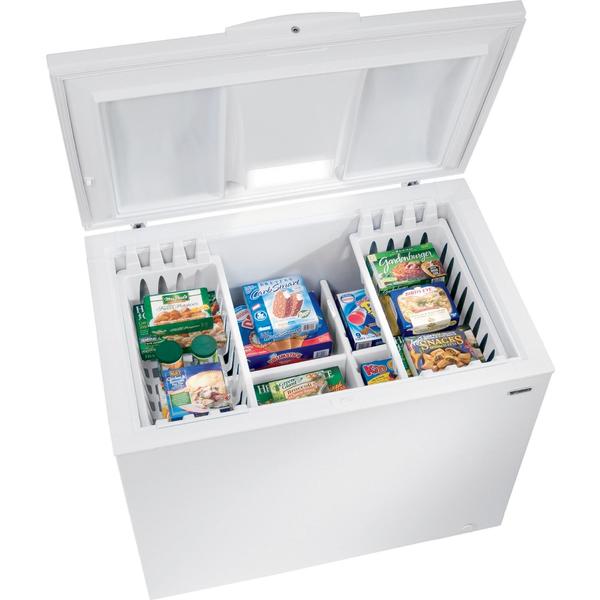 Kenmore chest freezers store extra frozen foods like premade meals in a horizontal space.